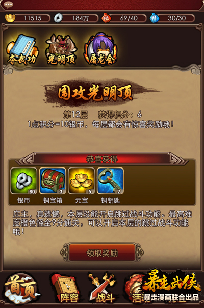 光明顶,大富翁的玩法,每过一层都有几率获得5元宝,还可以获取箱子和钥匙。这是一个很考策略的玩法,建议玩之前好好查下攻略,到达的层数越高元宝奖励也就越丰厚,而各种宝箱中更有高星级的武功秘籍与极品装备呢。