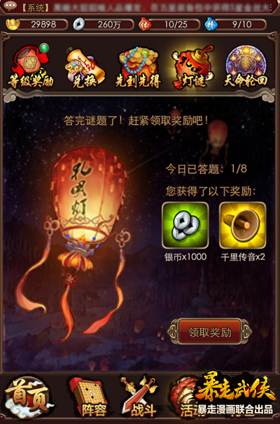 如此多要做的事情,可是体力就那么点怎么办?那就一定不要忘记每天中午12:00—13:00,下午18:00—19:00去趟客栈,可以免费回复大量体力的哦。此外游戏还有一项更大的福利,当玩家到达8级时还可以去猜灯谜,每天都可回答八道谜题,猜对不仅得到银币,而且还有几率获得千里传音、元宝、箱子以及高星级武功残章。