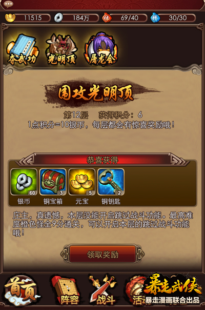 光明顶玩法在游戏首页导航栏的“战斗”中就可方便的找到,每天只能挑战两次,每过一层会有一定的概率获得5元宝,这也是一天中获得元宝的不错选择。且每层都有蓝、紫、橙三个等级的敌人,战斗难度依次递增,难度越高战斗后获得的积分奖励越高。