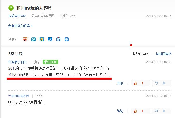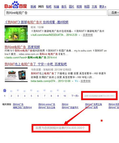 笔者在搜索引擎中输入“我叫MT电视广告”相关词组,发现其检索量高达5400万。值得一提的是,在大量检索信息内,除了包含各大媒体对我叫MT的相关报道外,在“百度贴吧”、“微博”、“人人网”等大众平台上,大量用户也对“我叫MT电视广告”产生激烈讨论。