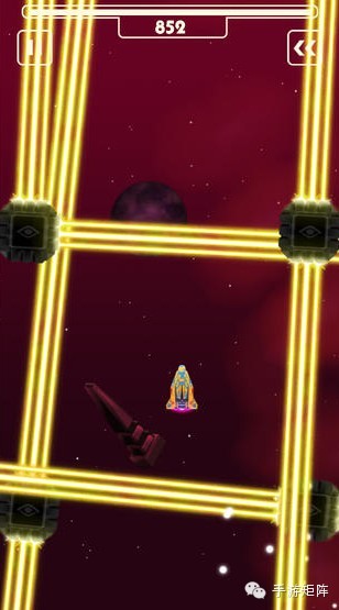 游戏采用了偏红色调来描绘这样一个深邃的宇宙场景,给人的感觉似乎处处沾染了血腥,一种负面和压抑的情感油然而生。 游戏只用简单的两三句话来向你介绍玩法,在这里玩家始终要以竖向视角展开冒险,在此基础上点击左右半屏来控制飞船左右移动,错了错了,准确来说应该是向左右斜上方移动,只要飞船的引擎加大马力就会产生向前的分力,如果你只是想让飞船径直行前飞行的话只要两根手指同时长按屏幕即可。