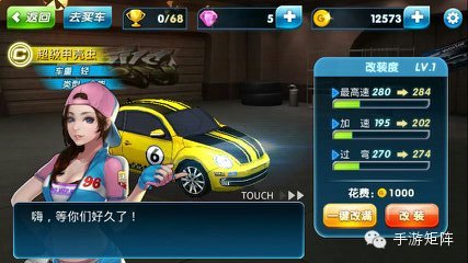 在爽完序章之后,矩叔就发现有点不爽了,壕车变成了二奶御座甲壳虫,其它车即便解锁了还各种贵,前期不充值不可能买得起。另外导航员也是,妹子只能用充值的钻石买,男导航员就用游戏币随便凑合了。