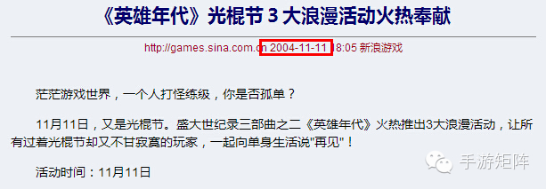 从网络上可查询到的资料来看,最早将光棍节作为节日活动的网络游戏是盛大游戏的《英雄年代》。在2004年11月11日,新浪游戏就刊登了关于《英雄年代》光棍节的活动,当时举行三大活动皆与“脱单”相关。从游戏史的角度来看,这是中国网络游戏第一个将网络节日纳入活动策的前例,虽然拿十年后的眼光来这些活动显得过于中规中矩,但是在当时不可谓不是亮点噱头俱足。