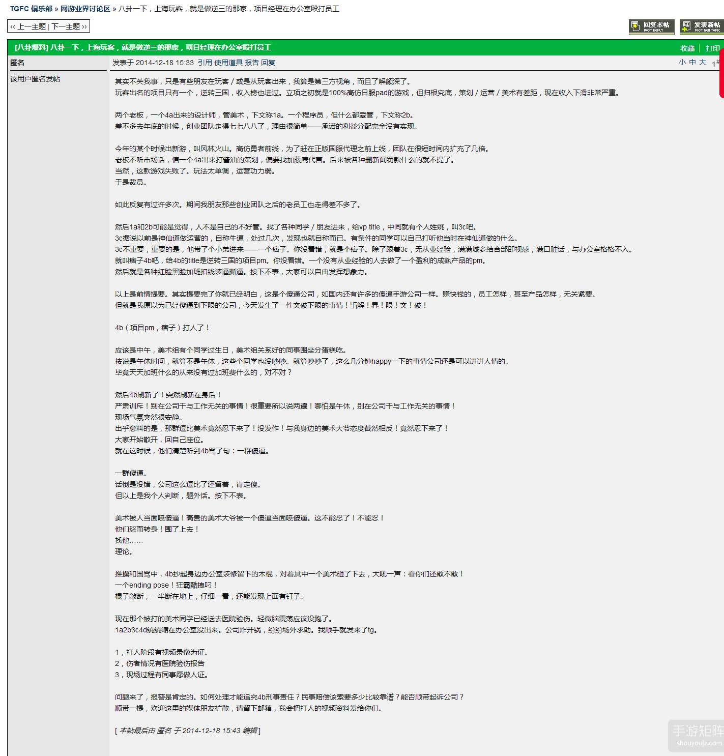 12月18日,正是中国游戏产业年会正在召开之际,以《智龙迷城》的国内”复刻”版一举成名的国内手游公司”上海玩客网络科技有限公司”却曝出项目经理殴打员工的事情。事情的起末已经由第三方上传到了TGFC 俱乐部论坛以下为论坛全文截图:
