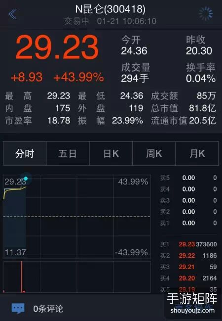 因为开盘上涨20%,于是在开盘之后,根据《关于完善首次公开发行股票上市首日交易机制有关事项的通知》等有关规定,深交所自今日09时30分00秒起对昆仑万维实施临时停牌,于10时00分复牌。而10点复牌之后,来势凶猛的昆仑万维涨幅达到43.99%,再根据深交所股票上市首日全日投资者的有效申报价格不得高于发行价的144%,昆仑万维今日直接涨停。而此时昆仑万维的市值已经达到了81.8亿元。