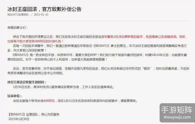 一直以来,玩家们总是三分调侃七分认真模仿运营商的口吻:“爱玩玩,不玩滚!”这也是自端游时代起,国内游戏巨头们就留给他们的主观印象——强势且霸道。不过随着手游时代的到来,整个游戏行业在发生剧变,运营商们似乎也开始一改当年自己死板任性的形象。就在今天1月30日上午,卓越研发、腾讯代理的手游《我叫MT2》发出了官方致歉公告,全区全服赔偿虚拟货币并且版本回滚(更新删除),最终平息了这场僵持两天、名为“冰封事件”的运营事故。