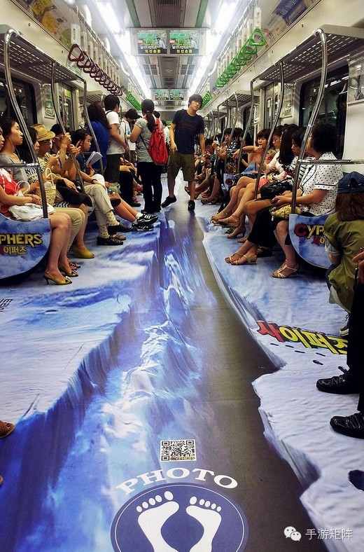 这种广告形式目前在国内比较少见,原因这种形式的投放更多的是偏向于品牌的宣传,而不是对产品本身的宣传,这种形式不太符合手游快热的现象,但是对于一些大型厂商来说是可以考虑的。不过这种投放对于国内地铁线拥挤的程度来说,除非是始发站,不然很多人是看不到的,因为根本挤不上车,哪还会留心脚下有什么东西?