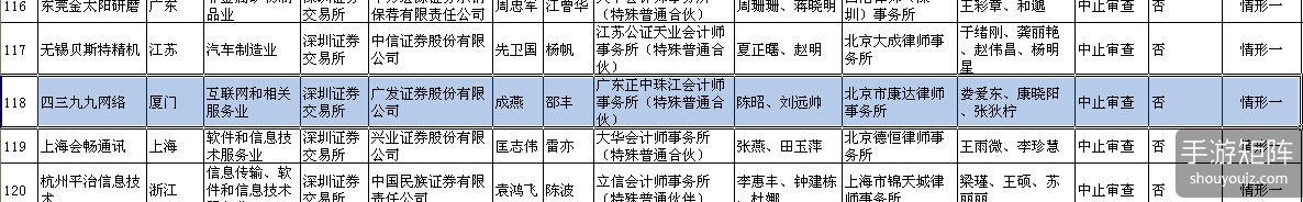 近日,证监会官网公布《发行监管部首次公开发行股票中止审查和终止审查企业基本信息情况表》。文件中显示,拟在深交所创业板上市的四三九九网络(以下简称4399)的审核状态为中止审查。理由为情形一:即“申请文件不齐备等,导致审核程序无法继续”。