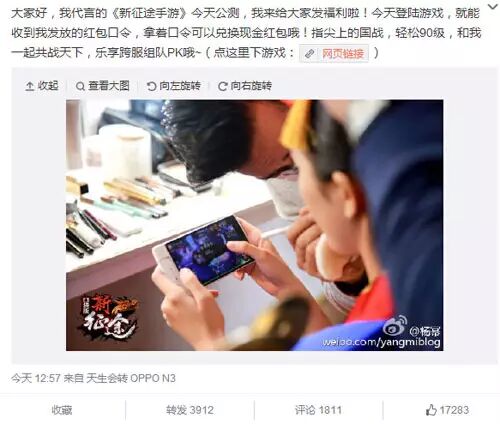 令人称道的是,杨幂给《征途》带来的不仅有她超高人气,还有令人眼花缭乱的话题曝光。如近期频繁在微博榜单、各大新闻客户端头条看到的“杨幂两米大长腿”,“杨幂Cos虞姬”,“杨幂粉丝用签名照表白”,“杨幂游戏玩到90级”等大众茶余饭后津津乐道的话题,都来自粉丝、玩家的自发传播。如此强大的粉丝、舆论号召力,不仅游戏厂商需要,更是渠道商刚需。