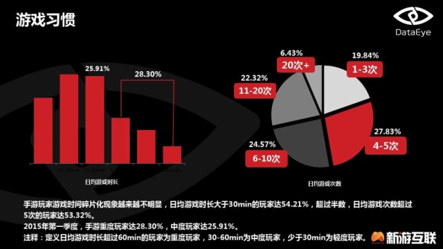 对游戏玩家而言,除了在视觉和听觉方面对游戏需要有震撼的感知外,对操作感也同样有极大的用户感知。而这一切在原本以模糊操作为主的手机屏幕上很难实现,同时,随着智能机性能的大幅度提升,这给予了整个智能游戏外设市场发展的提供了足够的基础。根据DataEye发布的《2015年Q1移动游戏数据报告》,我们更明显的看到移动游戏的多元化发展,以及用户的游戏习惯的碎片化越来越不明显,人均游戏时长的快速成长,整个手游玩家重度化比例越来越高。这更是直接为智能游戏手柄的发展奠定了良好的市场基础。