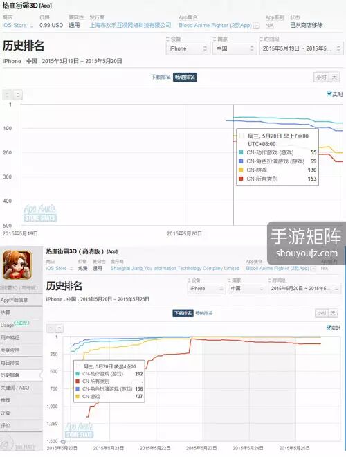 不过最终在短暂的上线之后,游戏再次消失不见。那么这是否说明这只是一个笑话呢?其实未必。在5月20日,《热血街霸 3D》早上7点重新被收录到排行榜之内,但是在3小时之前,也就是凌晨4点的时候,一款名为《热血街霸 3D 高清版》的游戏由上海江游信息科技有限公司上架到免费榜上,而上海江游信息科技有限公司和上海欢乐互娱科技有限公司正是同一家公司,欢乐互娱这一名字是由上海江游开发的竞技类休闲游戏网站(以下统称《热血街霸 3D》开发商为欢乐互娱)。也就是说,在游戏除榜之后,欢乐互娱就使用了另外的开发者帐号重新提交应用。如果如官方稿件中所说,在13天的时间里面解决了榜单除名的问题,那么这的确是一个不错的兆头,不过随后免费榜的上架似乎又超出了官方的预期。于是面对付费榜和免费榜双榜在线的同一产品,最后官方迫不得已选择下架其中一个。