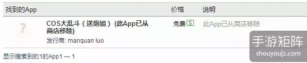 不过今天再次搜索《COS大乱斗》的时候,发现游戏已经不能再被搜索了,从App Annie上面的显示是此App已从商店移除。