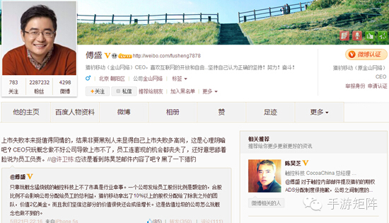 对于一向敢骂敢恨的傅盛来说,以上言论算不上过激,也算不上是这一“上市公司CEO对喷”事件的高潮。就在上述微博发布半小时后,傅盛终于忍耐不住,恶语相向大骂陈昊芝“上市失败本来挺值得同情的,结果非要黑别人来显得自己上市失败多高尚,这是心理阴暗吧?CEO只玩概念做不好公司导致上市不了,员工连套现的机会都丧失了,还好意思舔着脸说为员工负责。”