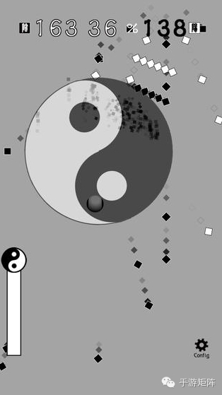 从《阴阳》的名字就可以看出,这是一个以中国传统概念为主题的游戏。在这个游戏中,玩家操控的是一个阴阳小球:它有两种形态,阴鱼和阳鱼,玩家只需要双击屏幕就可以在两种形态中互相切换。游戏的玩法也很简单:屏幕上会随机出现大量的由黑白块形成的弹幕,小球在阴鱼的状态下可以吸收黑色方块,画面变暗;在阳鱼的状态下可以吸收白色方块,画面变亮;反之游戏就会失败。不过注意了,以中国的传统智慧,阴阳是需要保持平衡的存在,游戏里也是一样,吸收一定数量某一个颜色的方块之后就必须翻转过来,去吸收另一个颜色的方块来恢复平衡,不然也会失败。值得注意的是,吸收方块的过程还伴随着古筝的鸣响,黑色方块的音色就比较低,白色方块就明显高;如果玩家操作的好,游戏的过程会是一曲悦耳的古韵。吸收一定数量的方块之后还会发动“无极”,消除掉屏幕上的所有方块。玩家的目标就是吸收尽可能多的方块,坚持尽量长的时间。