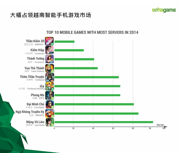 SohaGame不仅在发行数量方面领先,2014年SohaGame占越南市场总营收超过一半(52%)份额。如此年轻的发行商在2015年的上半年已经新开了300组服务器,比ME Corp、Appota、VNG、VTC Game。。。等其它发行商多3倍。详细如下,在2014年开服最多的手机游戏排名前十中,SohaGame已经拥有7款游戏,如:《梦武林》、《仙变啊》、《大明主》。