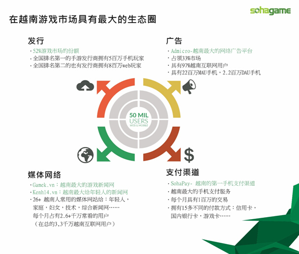 最关键的是SohaGame已经建立了最好的手机游戏渠道,占越南市场份额的52%。目前,SohaGame拥有5百万手游用户,8百万页游用户,这是SohaGame能顺利发行的条件。