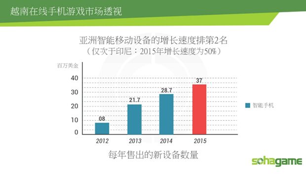 2014年越南智能移动设备的增长速度为28.7%,亚洲排行第二。预计2015年越南的智能移动设备增长速度会达到37%,这对越南手机游戏市场给予更大的发展。
