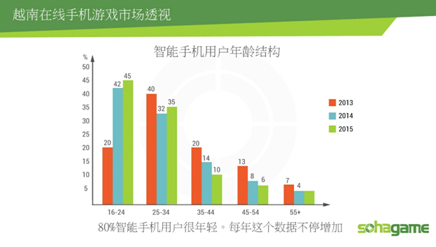 越南的总人口达9300万,网络用户数为38%,移动手机用户占93%,其中智能手机用户占55%。越南智能手机用户年龄大部分是16岁到35岁,这年龄段非常符合手机游戏等产品。