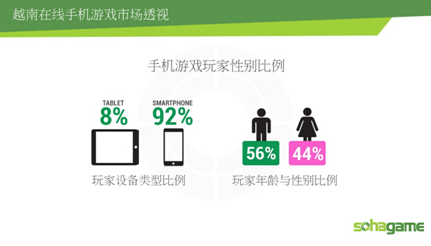 2014年越南智能手机数量增长速度很快,92%越南玩家之所以选择智能手机来体验游戏是因为这些设备特点是机身小,重量轻,功能多。玩家的性别比例差距不大说明越南手机游戏的普遍性和适应性很强(56%男玩家和44%女玩家)