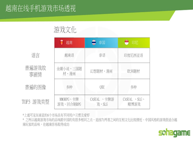 在传统文化方面越南和中国有很大相似,所以对游戏的题材选择有共同的爱好,如:剑侠、三国、漫画。。。等题材。其中,中国的历史文化的游戏题材一直都受越南玩家的欢迎,符合越南游戏市场。游戏类型多样化,就能很成功:MMORPG,卡牌游戏,回合制RPG。