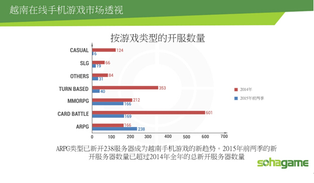 2014年卡牌游戏开服组数突破601服务器,仅次于卡牌游戏类型是ARPG类型为353组服务器。然而,2015年,ARPG将成为越南游戏市场的新局面,2015年前两季度已有238组服务器。