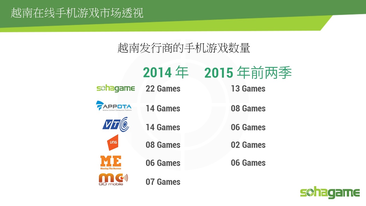 2015年越南发行的手机游戏数量为64款(2014年是77款游戏)。SohaGame仍然是领先者(2014年发行了22款游戏,2015年前两季度发行了13款游戏)。