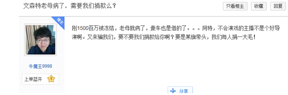 签约斗鱼时平台即给予文森特150万,然而其欺骗粉丝感情,谎称这笔钱要拿来治疗母亲的血癌,但是随后据网友爆出文森特买豪车登记图片,揭露了其骗子的身份。父母的生命,难道可以用来作为赚钱金钱的手段吗?难道也能拿来博取善良、忠实的粉丝们的同情心?金钱没了可以再赚,而拿粉丝的信赖与自身的信誉作为致富的敲门砖,无疑不是铤而走险,甚至是相当愚蠢地行为。