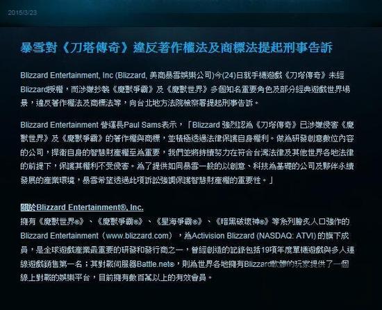 在今年3月份,暴雪在官网发布名为<暴雪对《刀塔传奇》违反著作权法及商标法提起形式告诉>的公告。暴雪方面负责人Paul Sams 表示:“暴雪认定《刀塔传奇》已涉嫌侵害《魔兽世界》及《魔兽争霸》的著作权和商标,并将积极通过法律来保护自身的权利。作为研发创意数位内容的公司,捍卫自身的智慧财产权至为重要,我们将持续努力在符合台湾法律和其他世界各地法律的前提下,保护其权利不受侵害。为了提供商如同暴雪一般的以创意、科技为基础的公司及伙伴永续发展的产业环境,暴雪希望透过此项诉讼强调保护智慧财产权的重要性。”