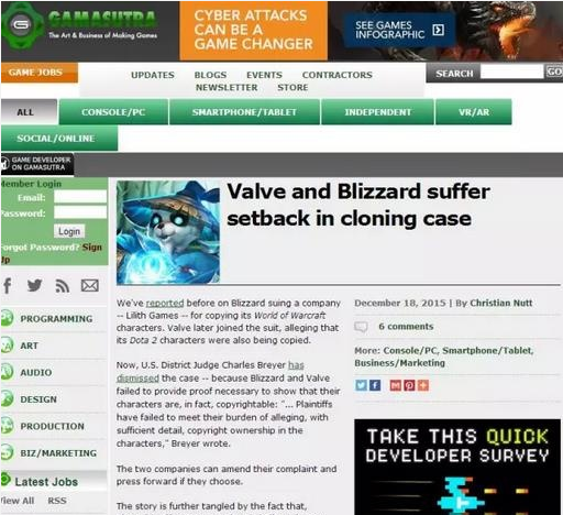 (Gamasutra上的一篇名《Valve and Blizzard suffer setback in cloning case》的文章报道)
