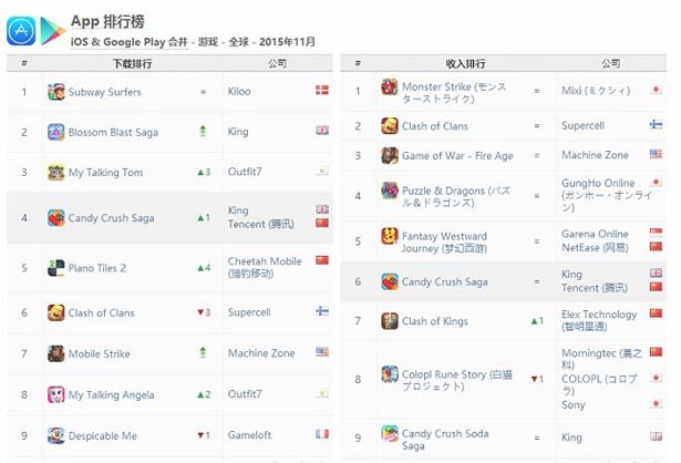 11月全球手游公司iOS+google play渠道排行榜