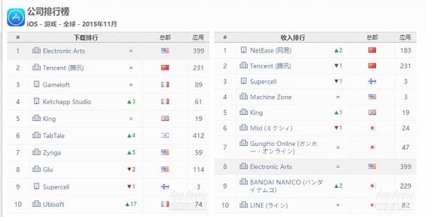 11月全球手游公司iOS渠道排行榜