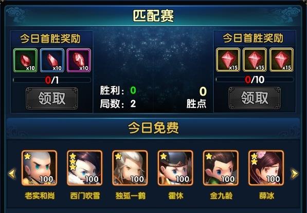在匹配赛中,玩家已经招募的侠客一律为100级,橙色品质,装备都为强化至100级、绿色品质,只保留侠客星级与速度属性。每周免费侠客一律为100级,橙色品质,穿戴的装备都为强化至100级、绿色品质,每周有12个免费侠客供玩家使用。在匹配到对手后,一方在战斗结束之前断线或退出战斗,则判定为负。玩家在匹配赛中赢得胜利可获取积分,积分达到一定程度可提升段位。而每月结算排名奖励,会给予玩家较多的竞技币,用来兑换各种道具。值得一提的是,该玩法同样是在玩家真人实时对战情况下的公平竞技。