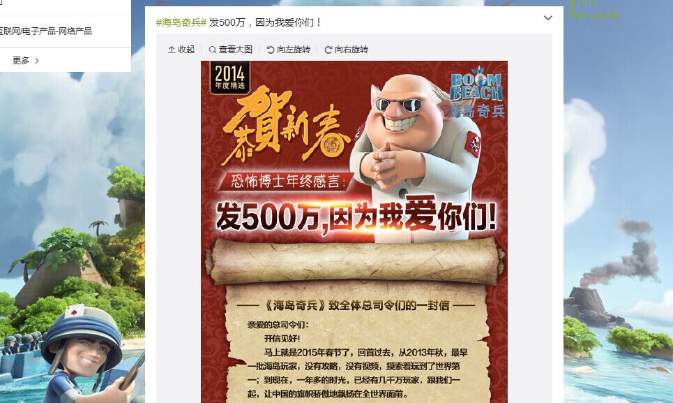 众所周知,《部落冲突》不但在全球极受欢迎,在中国表现也不俗,曾经连续5天霸占App Store畅销榜榜首的位置,如今也是名列前茅,可谓拥趸众多。在《海岛奇兵》获得成功后,Supercell从2015年下半年开始主推《部落冲突》,作为全世界同服的游戏,在中国无法像国产游戏一样每逢大假小节就派发福利,因此,春节期间回馈玩家也在情理之中。这个惊喜是什么呢?500万红包派发会再次降临吗?相信元旦过后谜底就会揭晓。