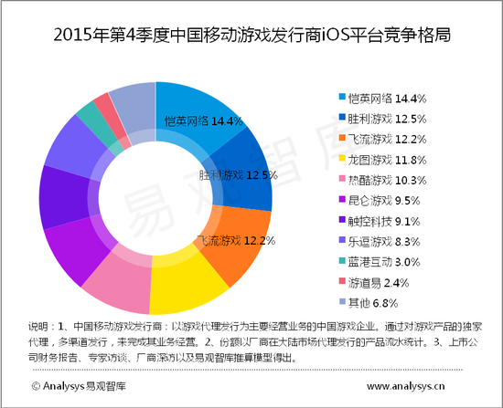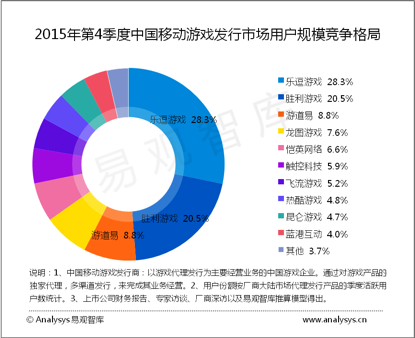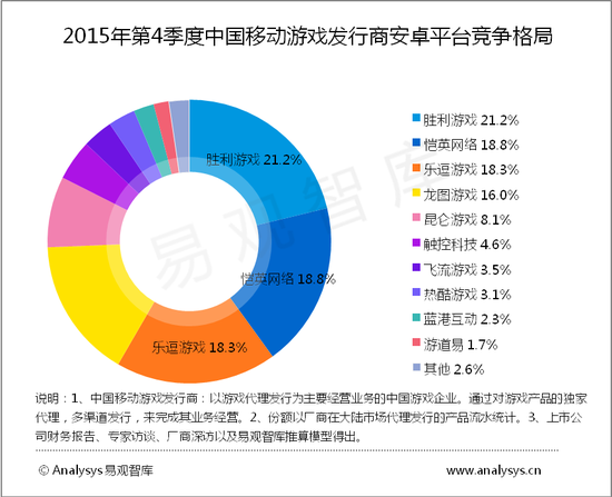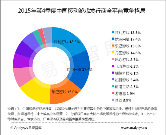 在全平台发行份额上,胜利游戏(中手游)得益于2015年第4季度上线的《功夫少林》、《星球大战指挥官》以及《新仙剑奇侠传》、《大航海时代5》、《决战沙城》和《三国威力加强版》等产品的平稳运营,连续十个季度领跑中国移动游戏发行商。第二、三名分别为恺英网络与乐逗游戏。