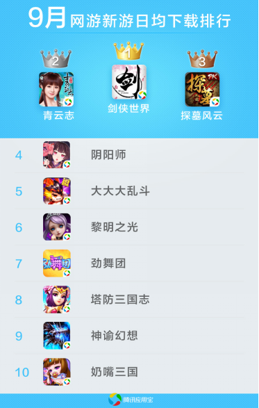 在网游新游排行榜中,《剑侠世界》《青云志》《探墓风云》《阴阳师》《大大大乱斗》《黎明之光》《塔防三国志》等手游强势占据下载、收入双榜席位,7款手游不仅质量上乘,同时更具备强劲的吸金能力,成为9月综合能力十分出众的手游新军。这也是榜单首次出现7款新游同时跻身双榜的盛况。而《青云志》借助电视剧的热播,一出世就迅速跻身网游新游下载榜第二以及收入榜第四的佳绩。