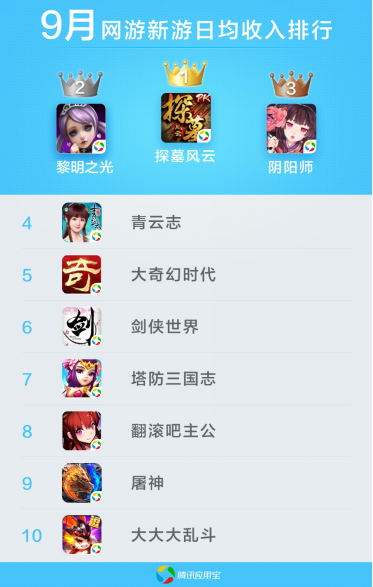 此外,日式和风回合制RPG手游《阴阳师》,因唯美极致的画风、经典与创新的多样玩法受到玩家的高度关注和追捧,获得下载榜第四、收入榜第三的成绩。《塔防三国志》借助应用宝自制节目——九大卫视联播的《星APP风云榜》节目的强势曝光迅速崛起,挺进网游新游榜TOP10。