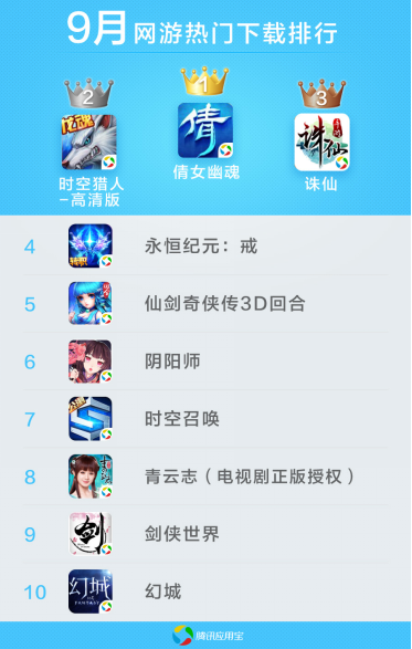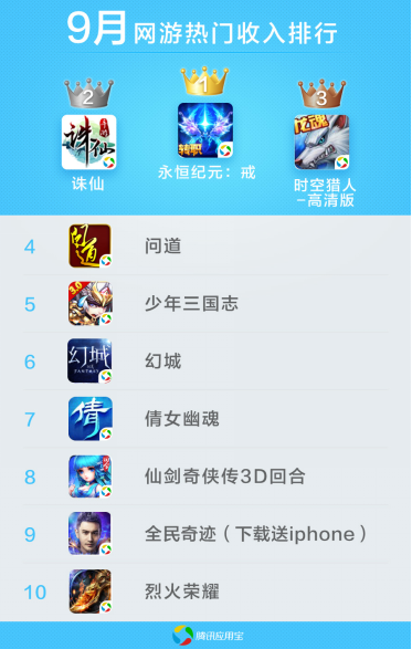 此外,网游热门下载榜第四,收入榜第三的RPG手游《永恒纪元:戒》,在应用宝渠道单日收入继上次破获200万后双倍增长,再破400万大关,强势刷新单日单渠道流水记录,《永恒纪元:戒》的超强吸金能力使其成为9月手游市场绝对的明星手游。