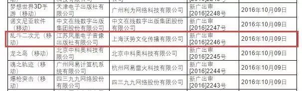 | 同人圣三国蜀汉传(移动) | 华东师范大学电子音像出版社有限公司 | 上海酷幻网络科技有限公司 | 新广出审[2016]2687号 | 2016年10月25日 |