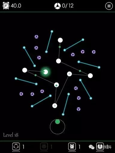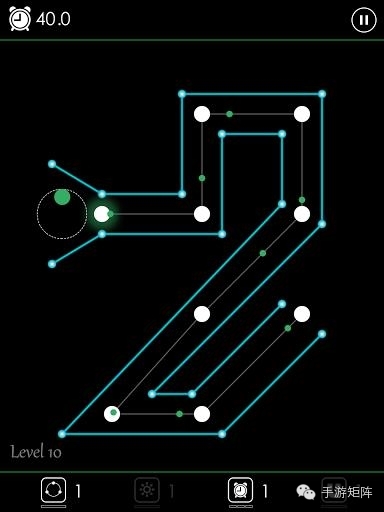 游戏的玩法很简单,倾斜手机屏幕,通过重力感应让小球在屏幕中滚动,去触碰那些白色的圆点,它们就会变成绿色,只要将屏幕上所有点都依次触碰完毕就算过关。白色圆点都是有次序的,前一个圆点和后一个圆点之间会连出一道直线。随着游戏的深入,关卡的难度还会逐渐递增,路径上的蓝色光线会让你感到不胜其烦。