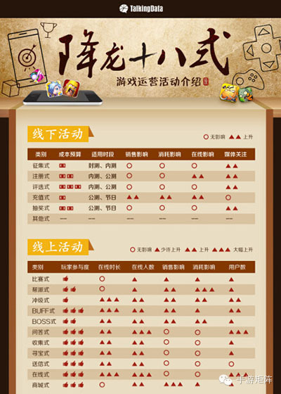 最近TalkingData发布了一张18种活动分析图,比较全面地为业内提供了参考信息。其中意见征集、注册有奖、玩家评选等活动形式可谓丰富,但对广大苦逼活动策划们来说,还是缺少现成的模板可供参考。