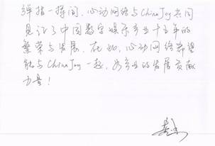 在此,ChinaJoy主办方汉威信恒非常感谢黄一孟先生对ChinaJoy展会的衷心祝贺,并由衷感谢心动网络多年以来对ChinaJoy的大力支持!