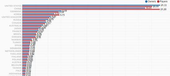 通过SteamSpy数据统计,我们可以看到目前《绝地求生》销量增长十分凶猛,在刚刚突破600万不久,又迎来了700万的新纪录!而通过地理分布来看,中国和美国的销量占据了40%,其次由德国、韩国、英国、俄罗斯等地区占据3-6名。