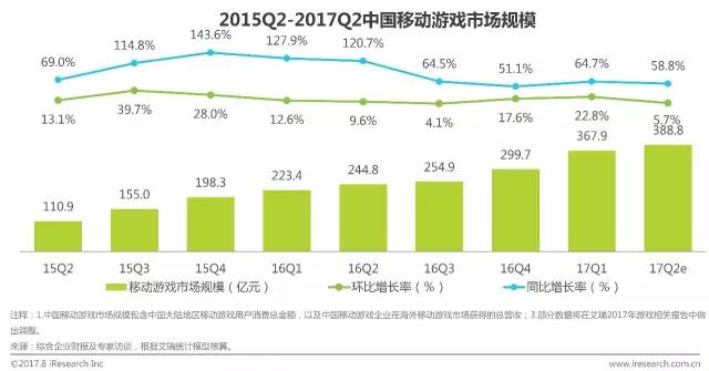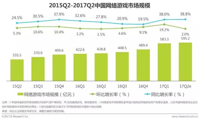 2017Q2,中国网络游戏市场规模达595.2亿元,环比增长2%,同比增长38.8%。由于季节性原因,环比增长率略低,市场呈现低水平增长。