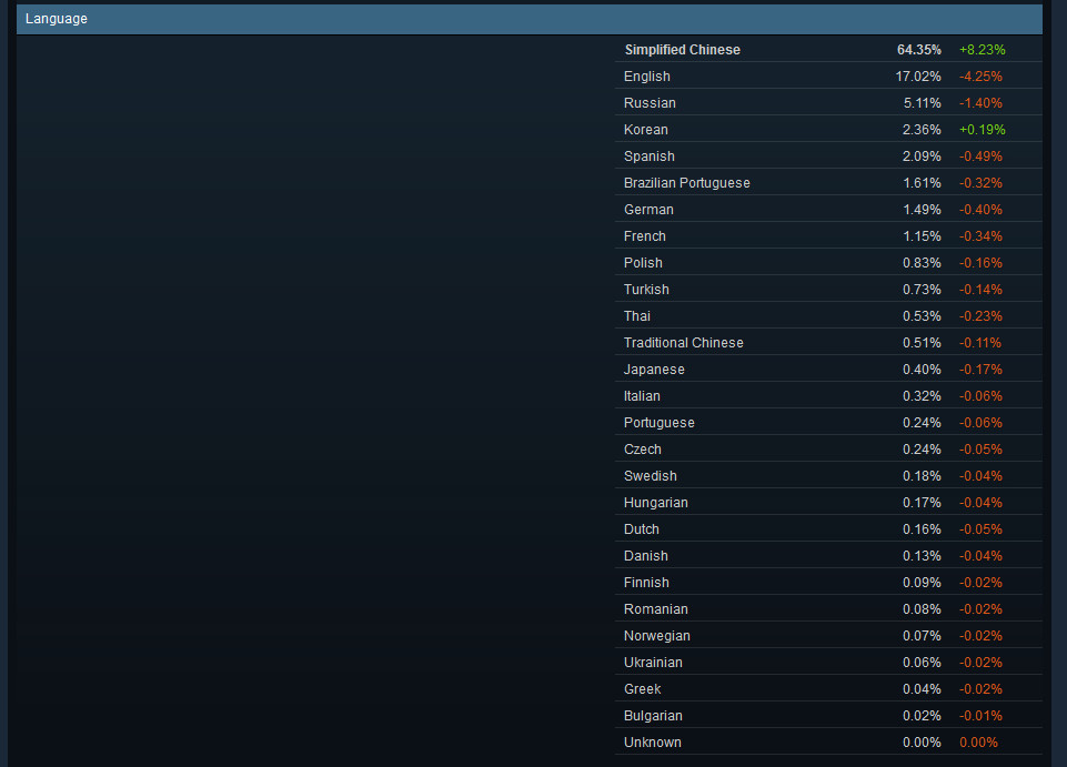 在11月份的调查报告中有一项语言分类,可以看到使用简体中文的玩家大幅成长,已经达到整个Steam的64.35%,单单一个月就暴升6.67%。而紧接着的是英语系玩家,约17.2%,至于台港澳使用的繁体中文占比则为0.51%,比起上个月则下跌了0.11%。