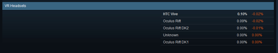 在Steam的官方报告中,还可以看到另一项有趣的数字,就是关于VR设备的应用,VR问世已经快满两年,大多数的PC VR游戏也集中在Steam上,不过占比上则是非常低,仅0.2%的玩家有在使用VR来玩游戏,其中HTC VIVE和Oculus占比约各半,值得一提的是,由于Oculus不断打出促销,HTC VIVE的玩家数量正在逐步的缩小中。