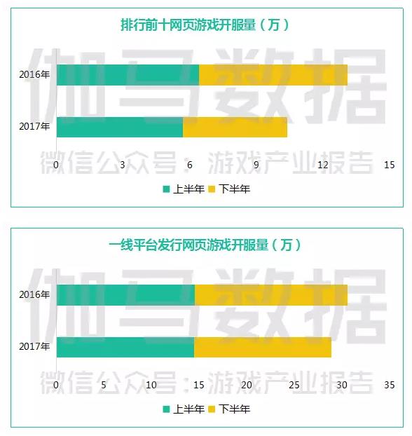 中国网页游戏开服数量的降低,也说明其市场规模仍在萎缩。报告显示,今年排行前十网页游戏开服量约10万,相对2016年下降3万。同时,今年一线平台发行网页游戏开服量约29万,相对2016年减少1.6万。两方面的数据下降情况均能够佐证网页游戏市场的发展情况。