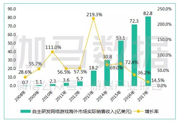 海外市场方面,报告显示,今年中国自主研发网络游戏海外市场实际销售收入达82.8亿美元,同比增长14.5%。