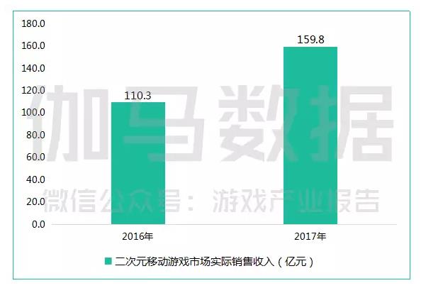 二次元游戏方面,报告显示,今年中国二次元移动游戏市场实际销售收入达159.8亿元人民币,同比增长45%。2016年上线的《阴阳师》《崩坏3》等产品表现稳定,2017年新上线的《神无月》等产品营收快速增长,从而提升了二次元产品在游戏市场的表现,使二次元游戏市场成为了移动游戏市场重要的细分领域。