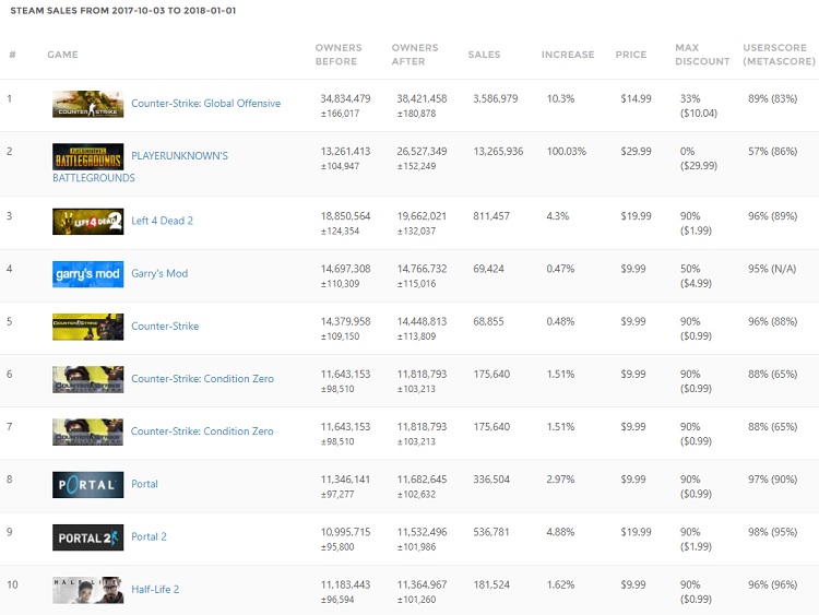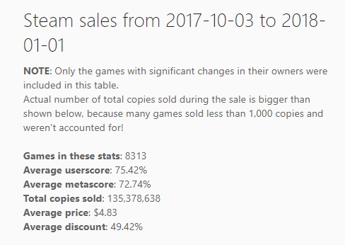 新的一年开始,Steam Spy统计刚刚过去的2017年第四季度、去年10月3日截止到今年1月1日在Steam上所有游戏的销售排名。首先是总体数字,榜单统计的游戏一共有8313款,2017年第四季度Steam共卖出了1.35亿份游戏。游戏平均价格为4.83美元,约合人民币31元,平均折扣幅度为4.9折。
