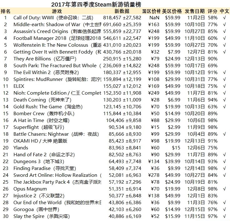 榜单中还有一大显著特征是中文语言的侵入,根据榜单信息,SteamCN论坛网友ErivRan制作了2017年第四季度Steam发售新游销量榜前30的表格。其中,共有21款新游拥有中文,前6名当中甚至全部自带中文,而前十名中也只有2款产品没有中文。